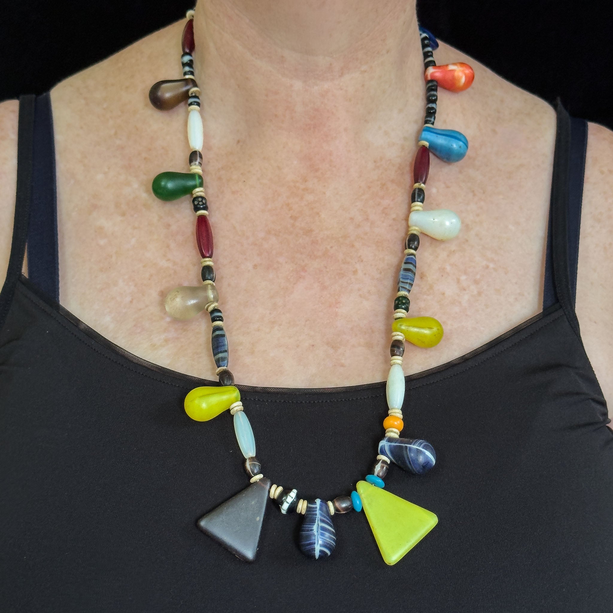 This necklace is very colourful with a mixture of patterned and plain beads of different sizes. It slips nicely over the head for wear. The stringing has been replaced in its lifetime. A unique necklace to collect or wear and treasure.