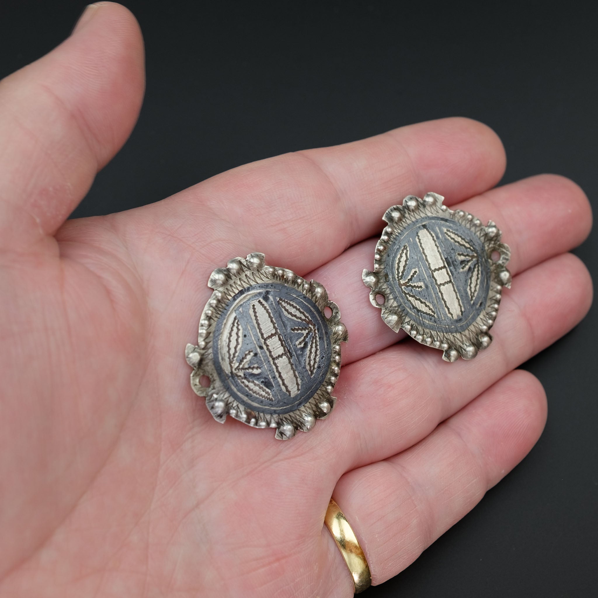 Two matching antique and rare high-grade silver pendants with niello design, made in the Ida ou Nadif tribal region of Morocco. They are likely to have been originally attached to traditional head adornment. In very good antique condition. Collectible or useful in designing your own jewellery with antique elements.
