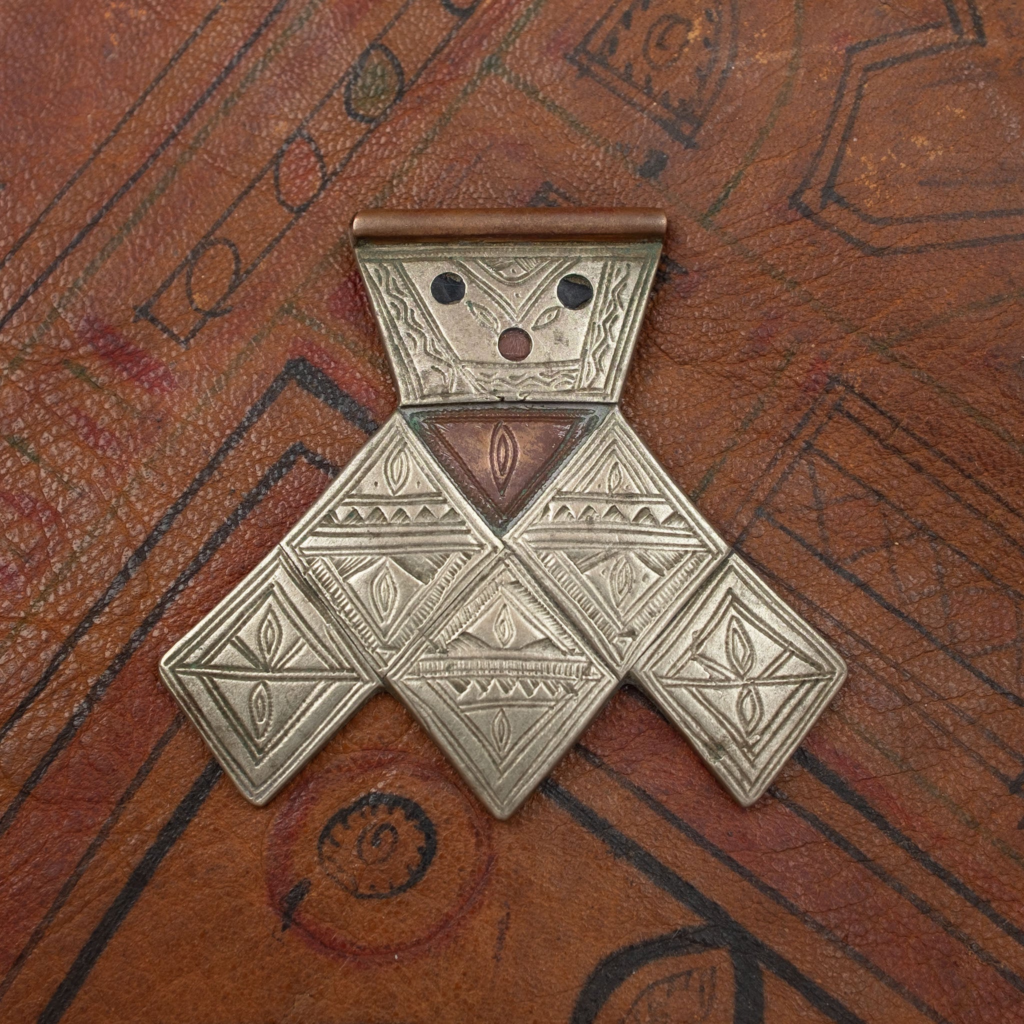 The decorated silver sheet on which the diamond shapes are cut and engraved is mounted on a copper base. Small leather inserts add further decoration to the top of the khomissar. Wearing a khomissar is believed to ward off the ‘evil eye’.
