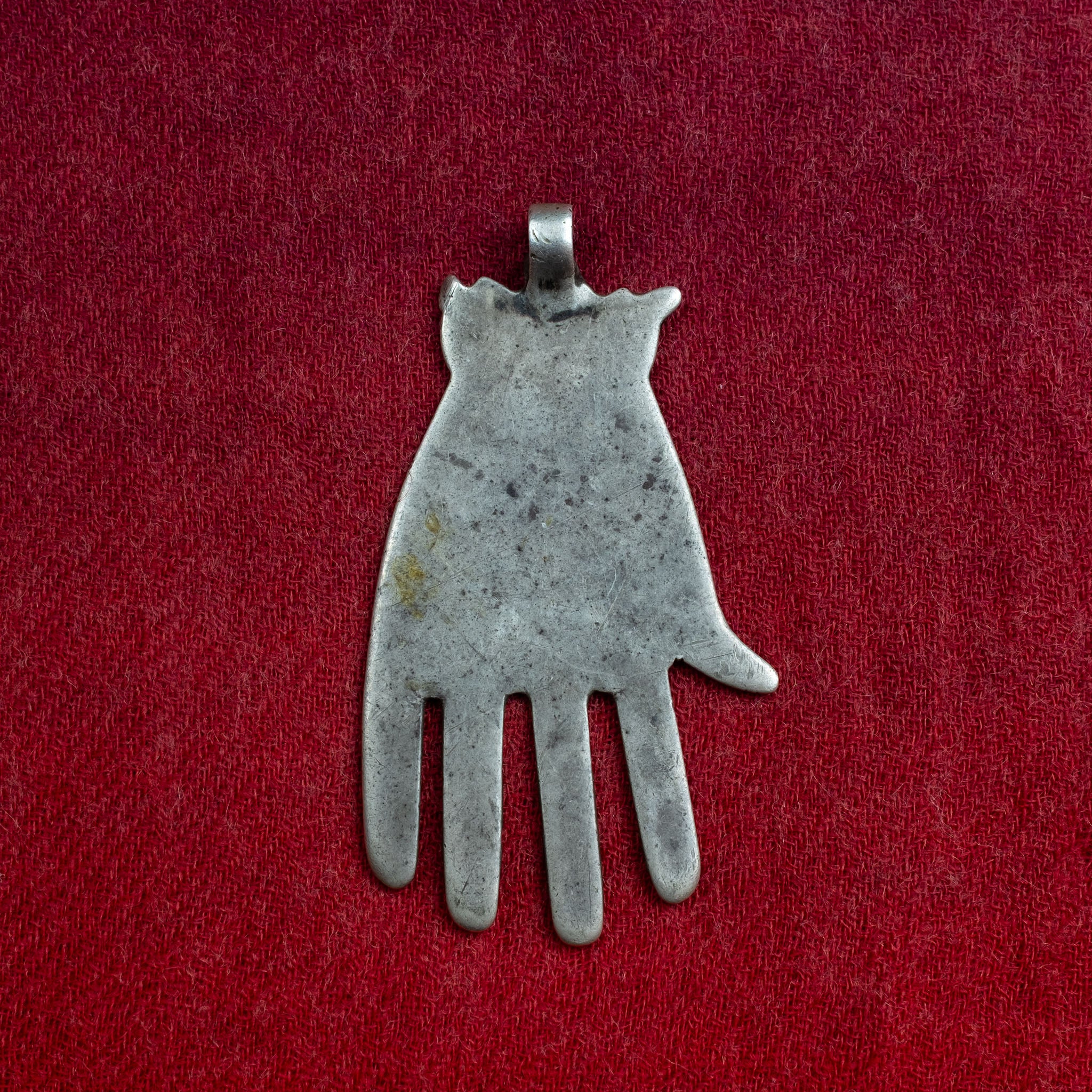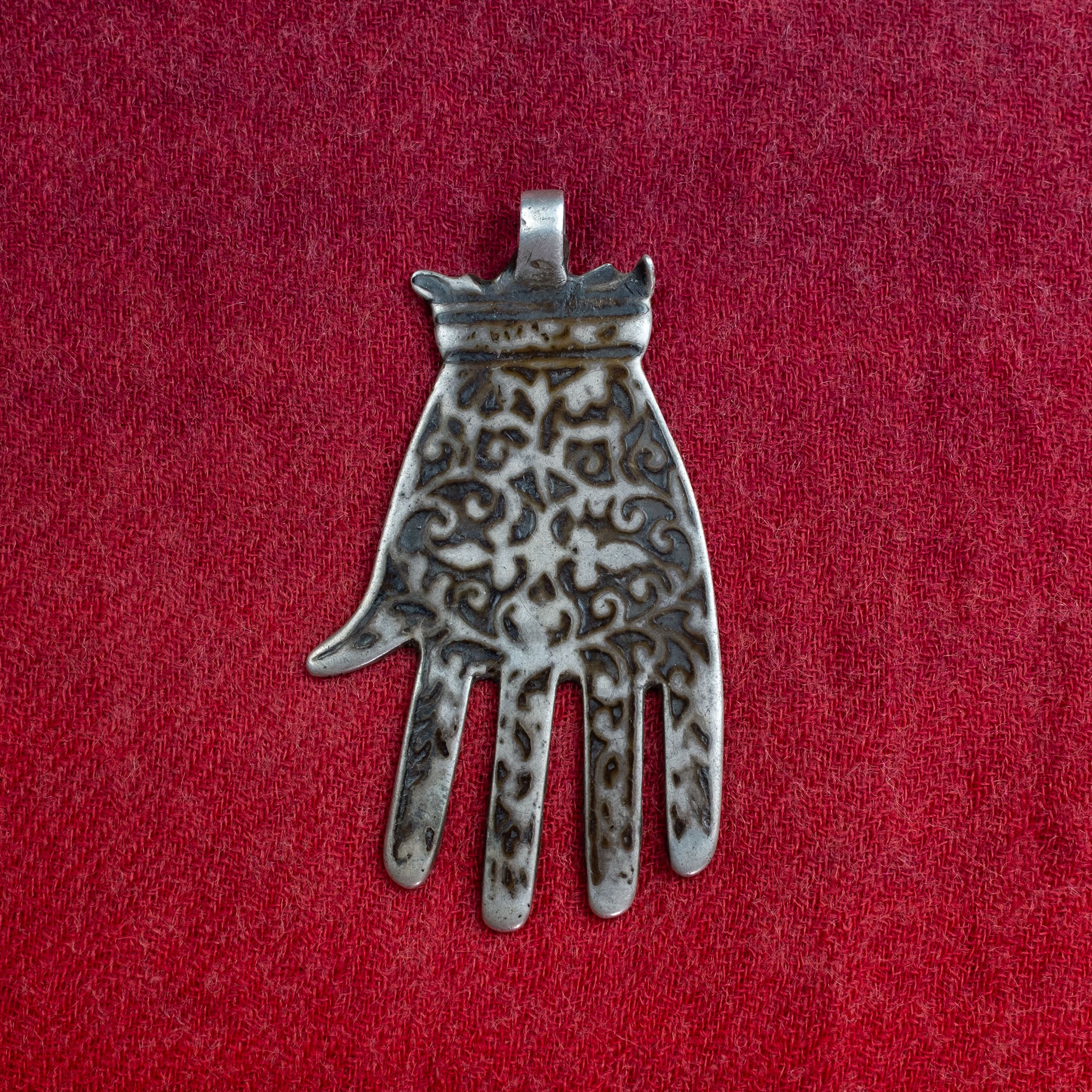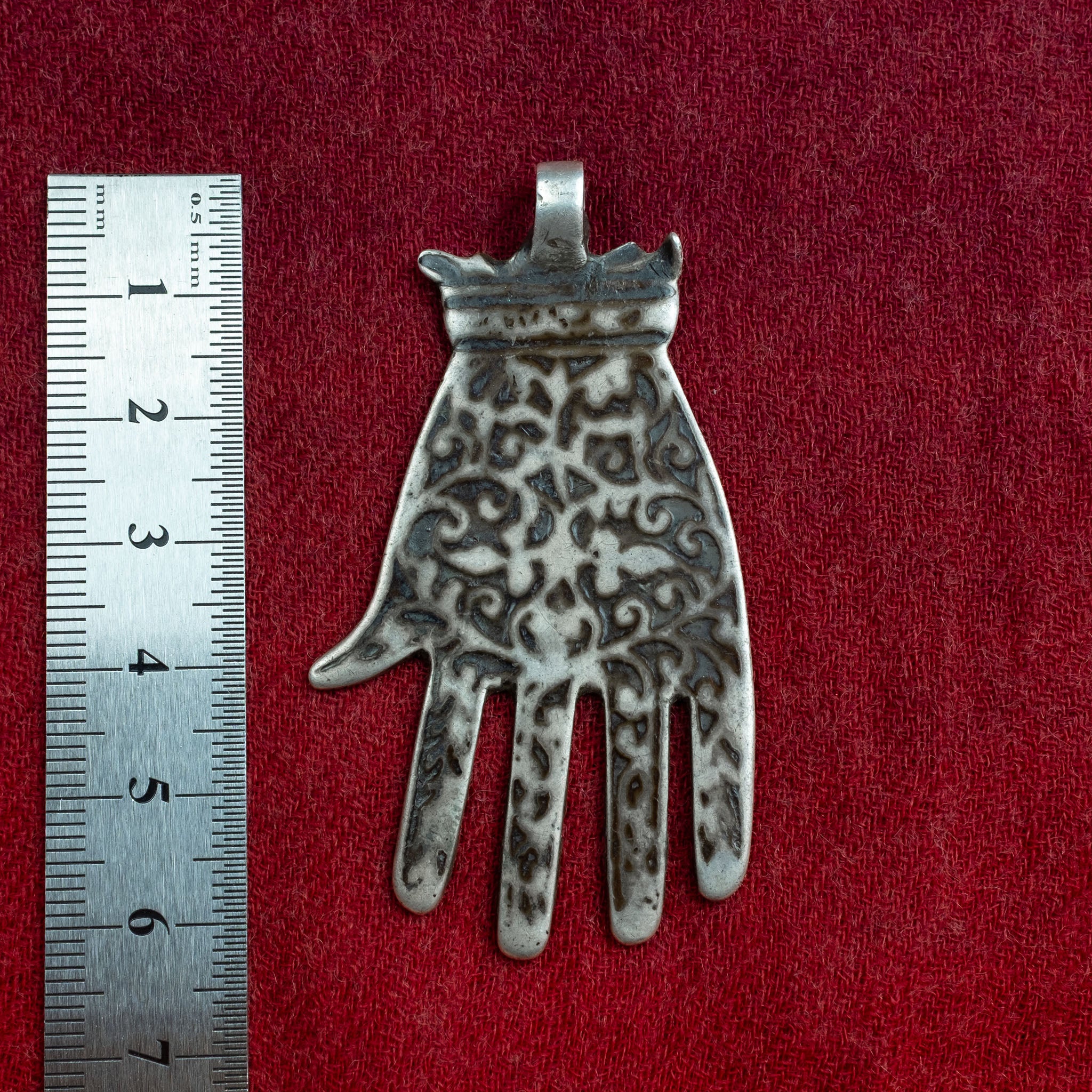 Beautiful antique silver khamsa with a nicely cast design, made in the 1920s in the coastal town of Essaouira, Morocco. Niello has been used to fill the etched design and the khamsa has then been polished to create a smooth surface.
