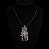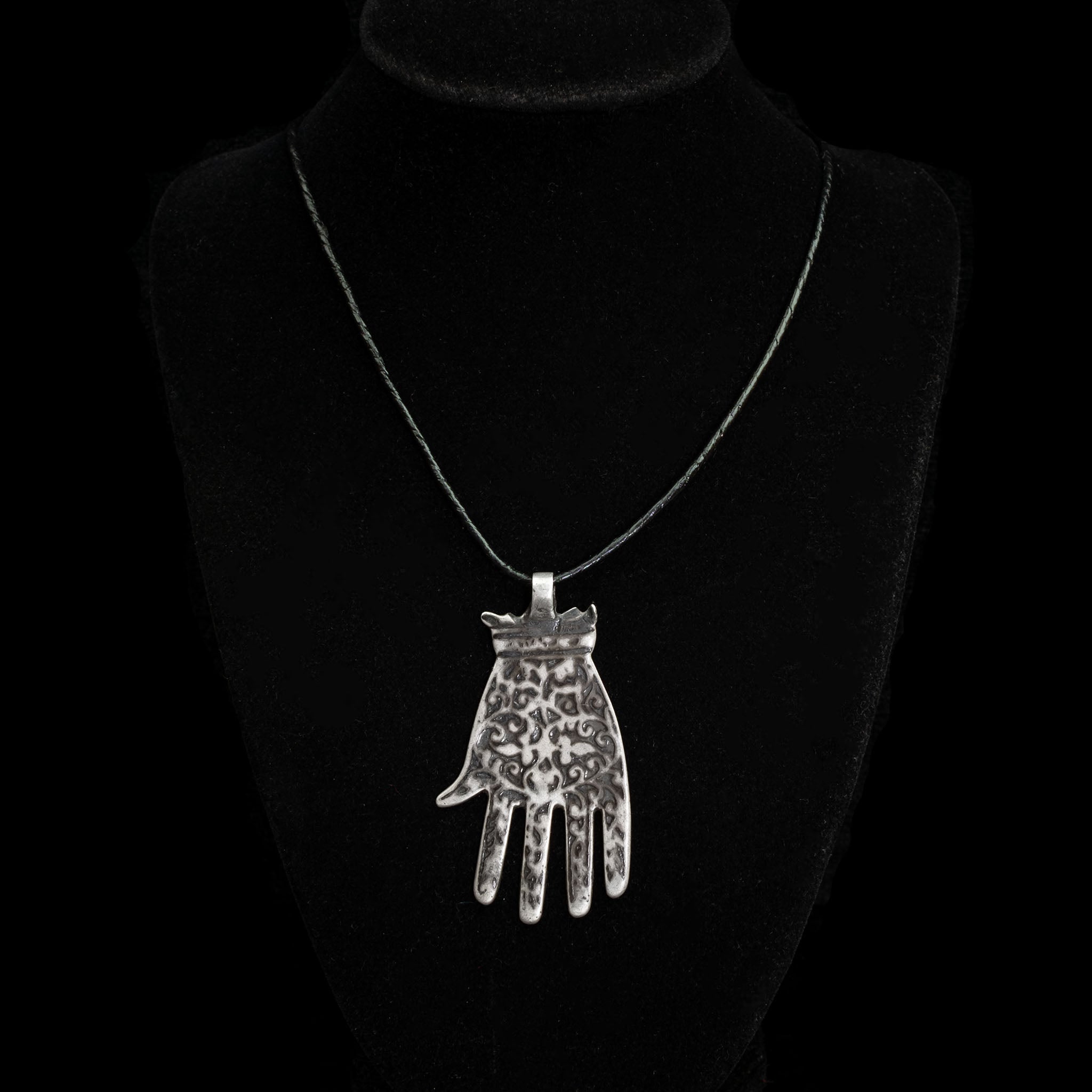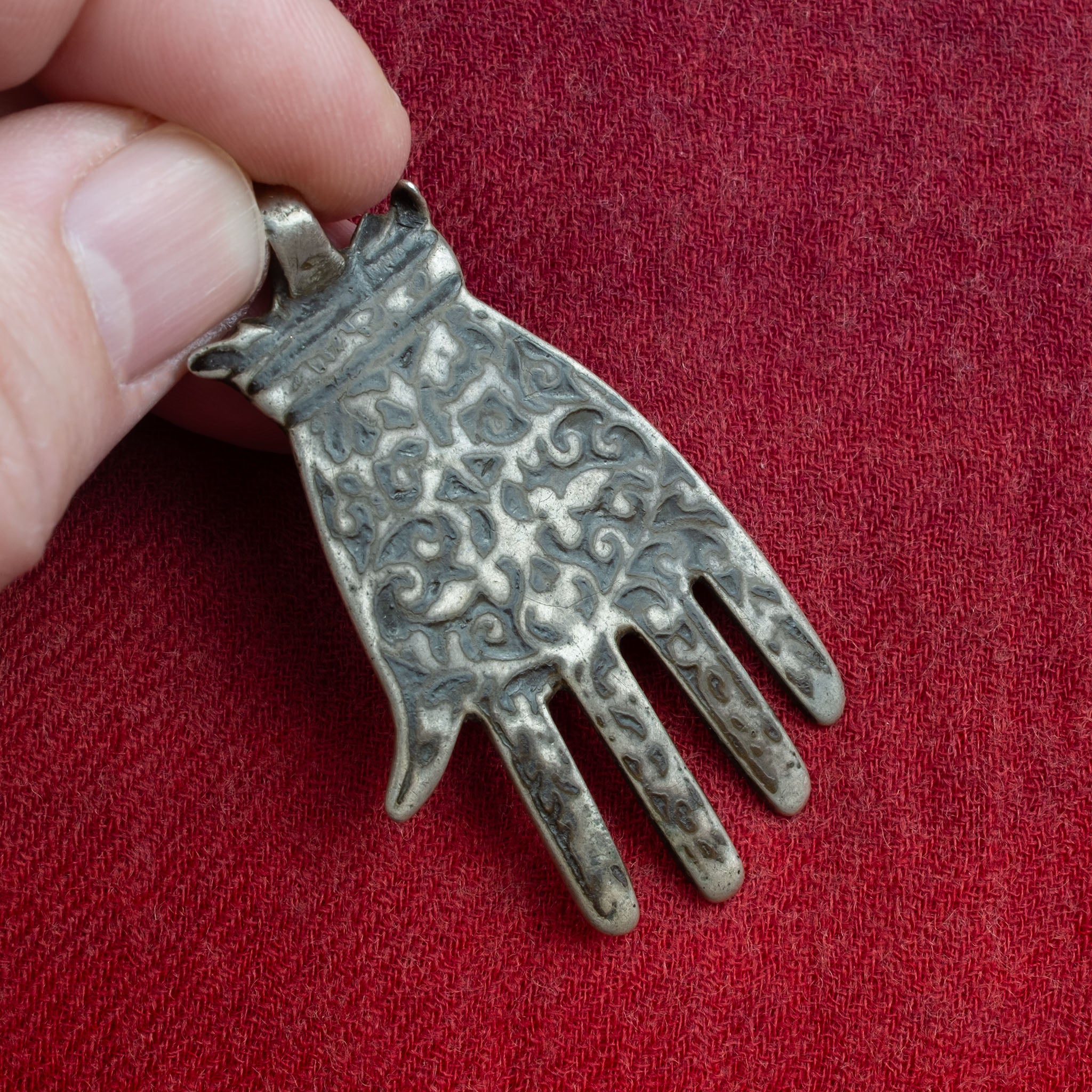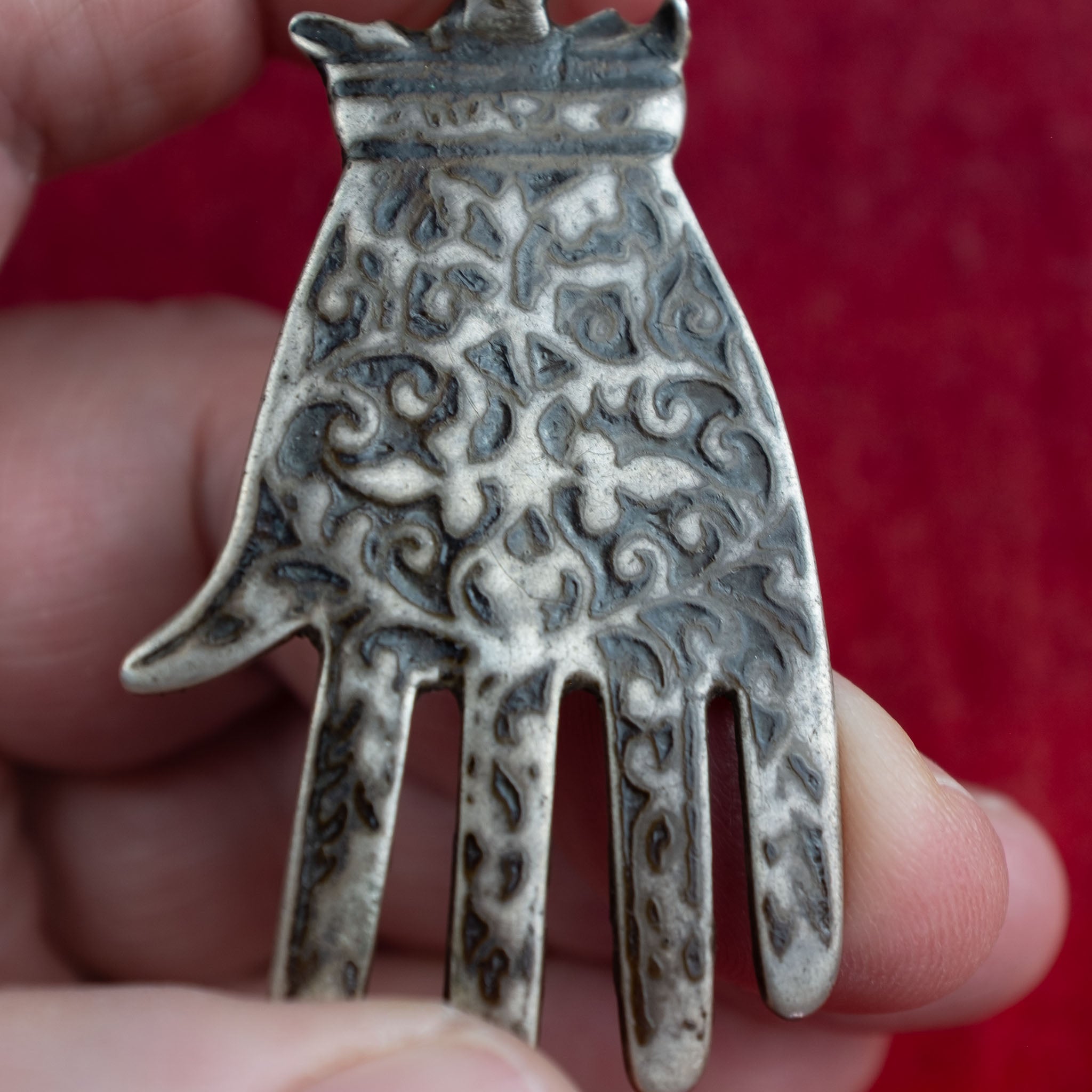 Beautiful antique silver khamsa with a nicely cast design, made in the 1920s in the coastal town of Essaouira, Morocco. Niello has been used to fill the etched design and the khamsa has then been polished to create a smooth surface.