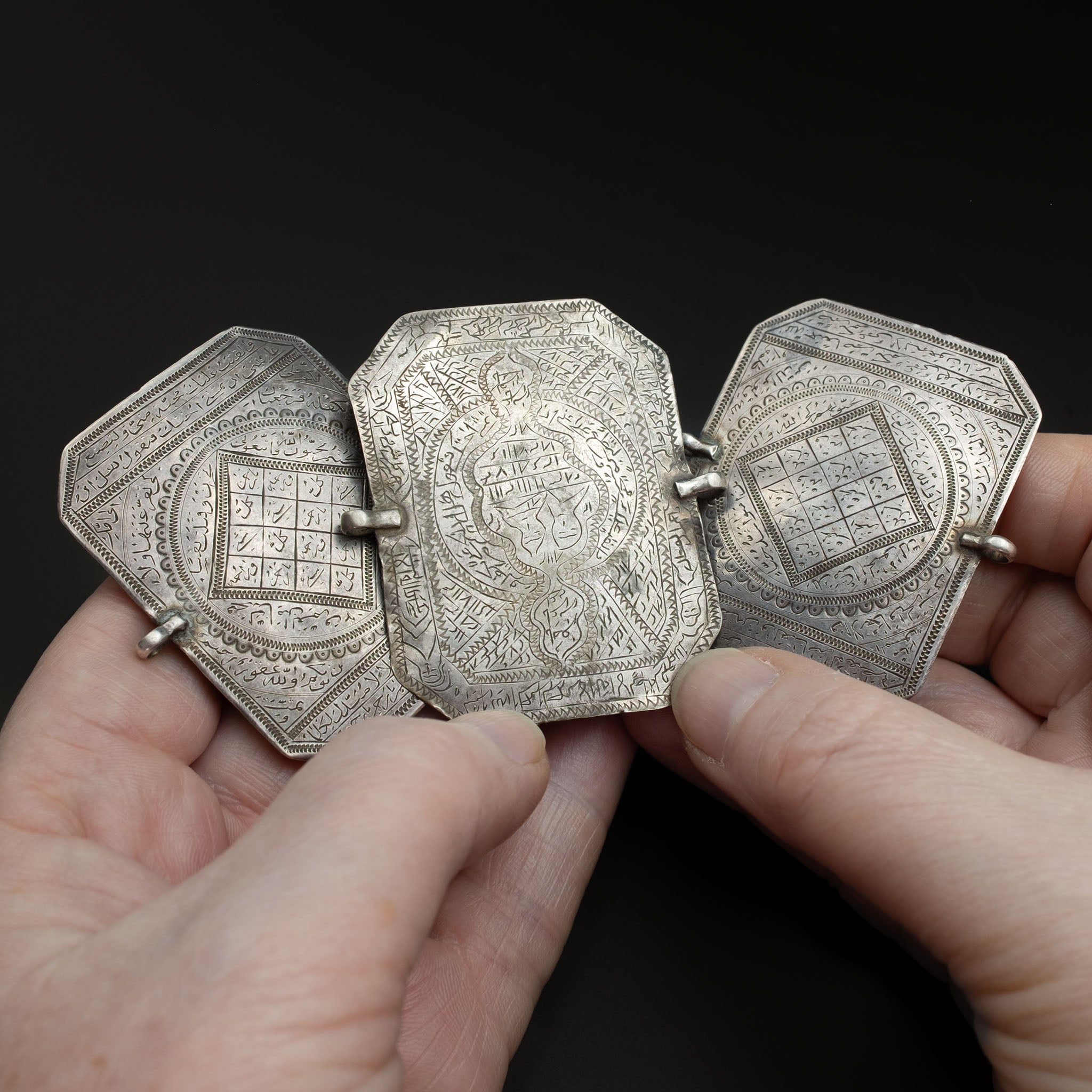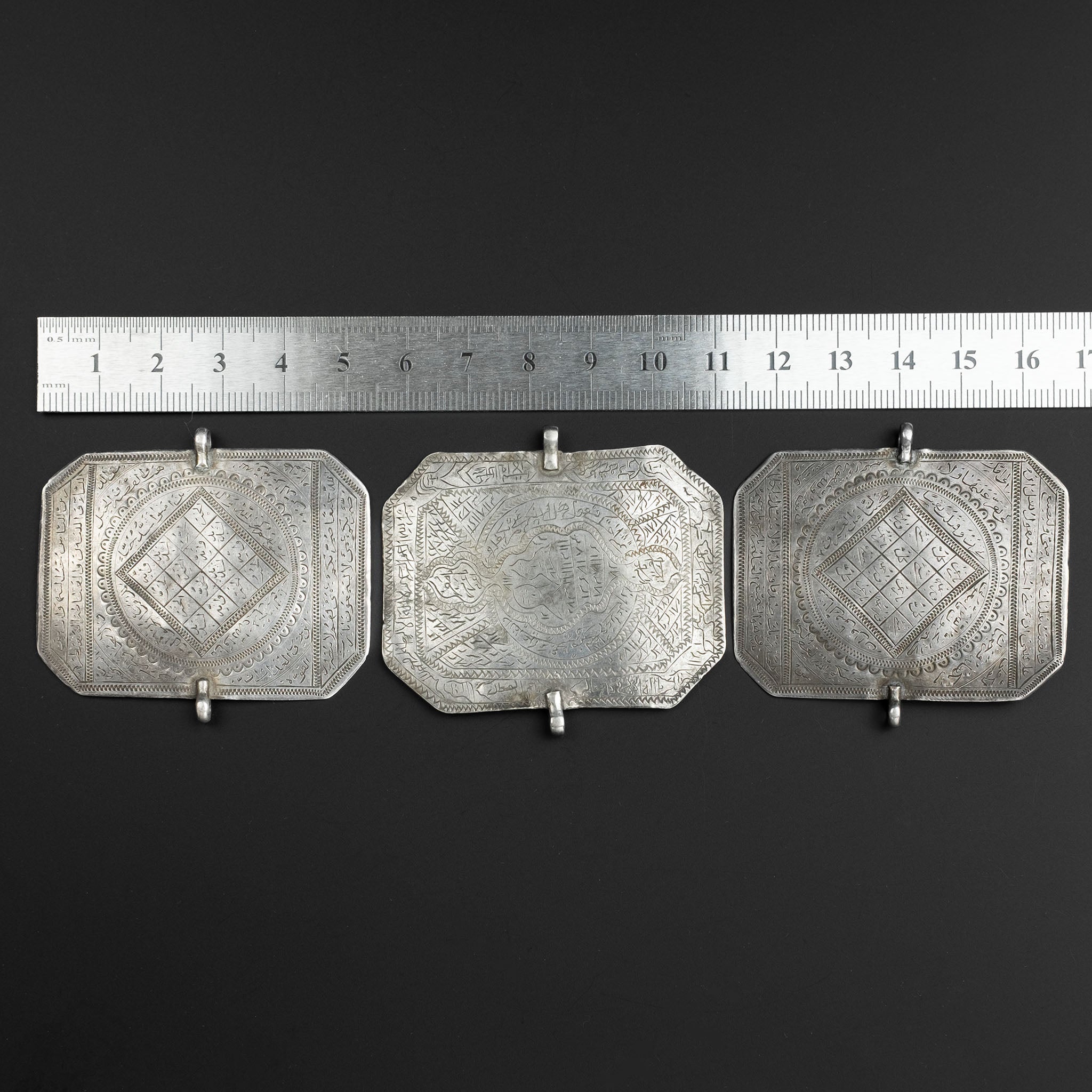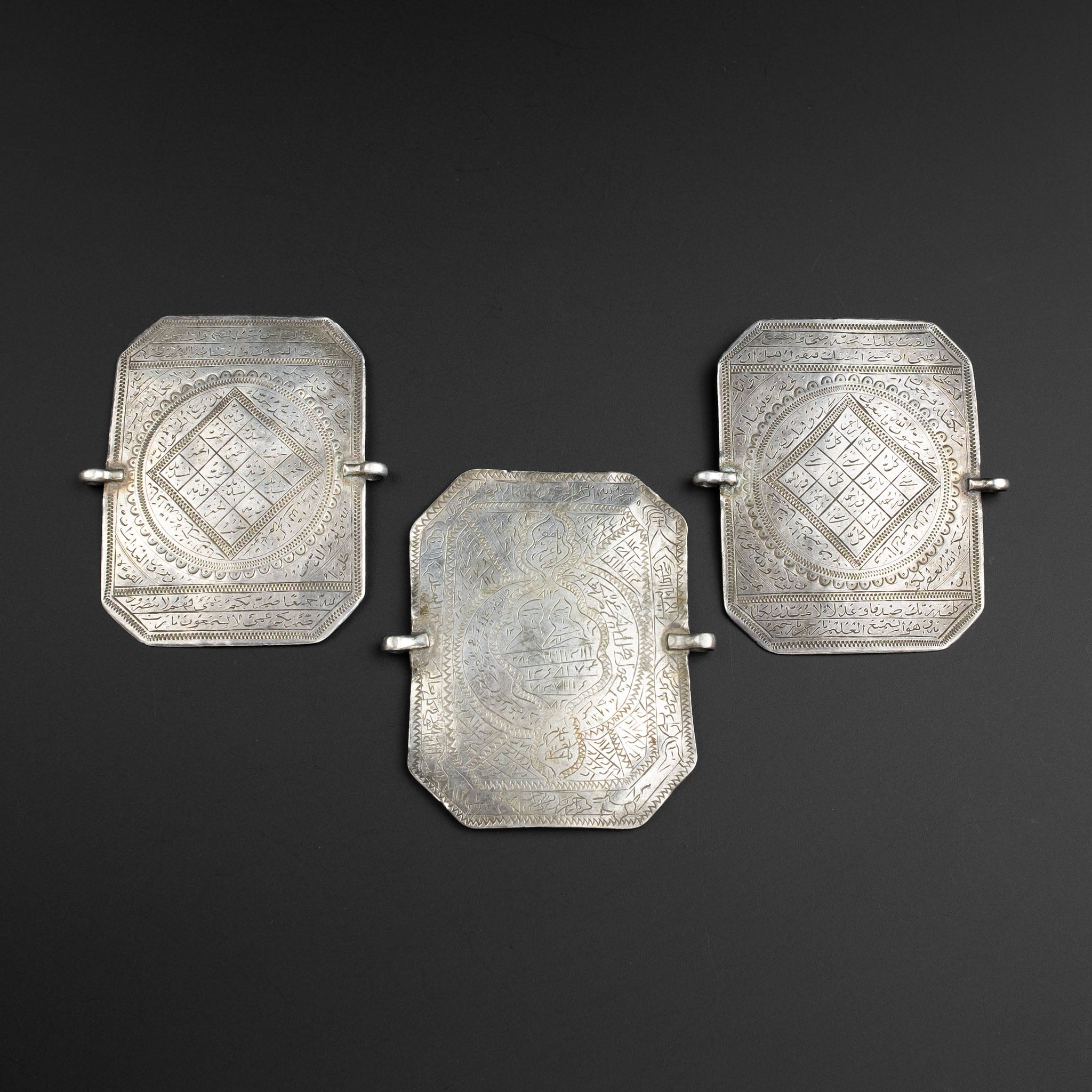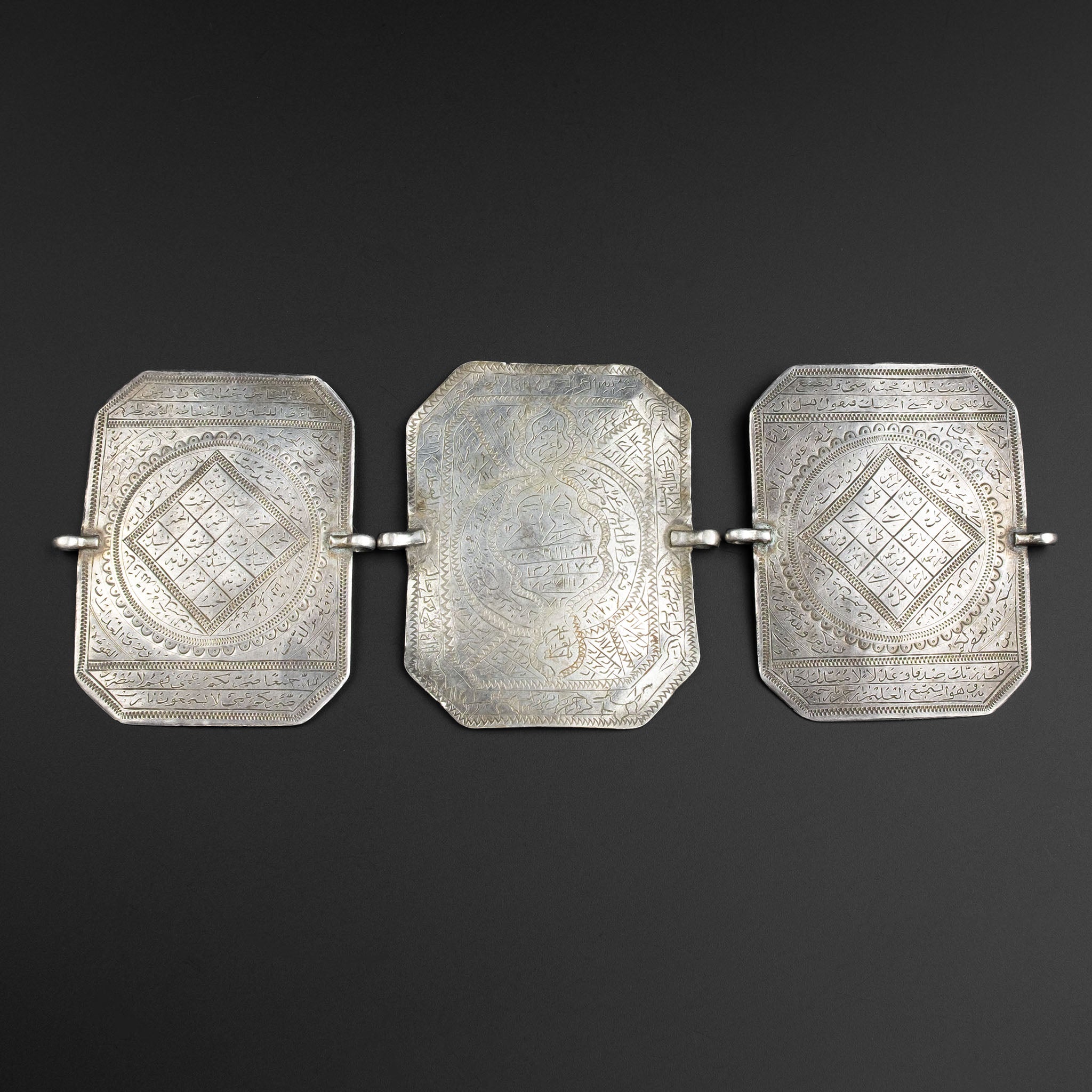 These are three magnificent plaque amulets from an old Islamic bazuband, made in the Qajar era. They form an upper arm ornament believed to offer protection from both physical and spiritual harm. The plaques are finely engraved. Two of the plaques appear to be identical; the third presumably has been worn as the central piece to this bazuband.