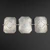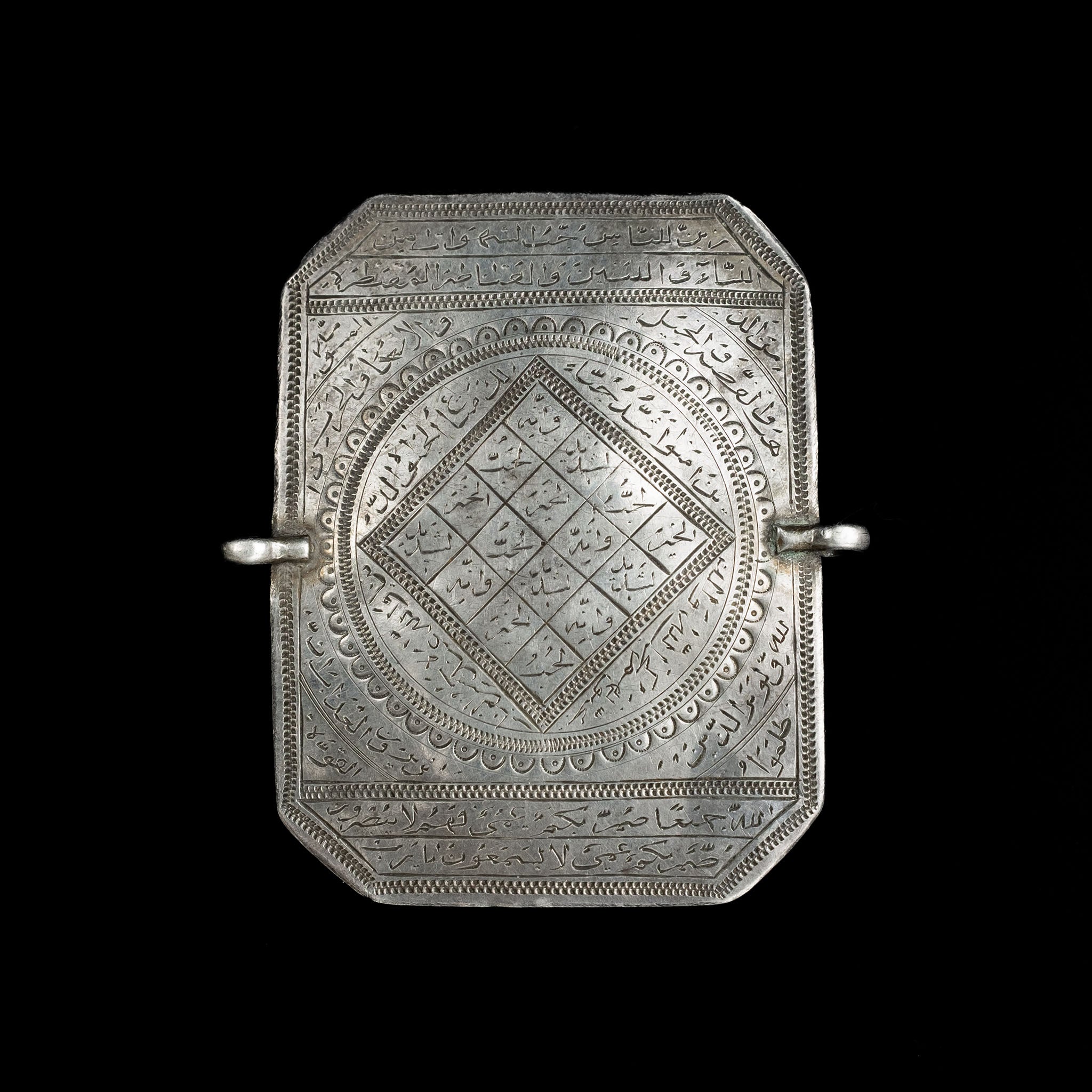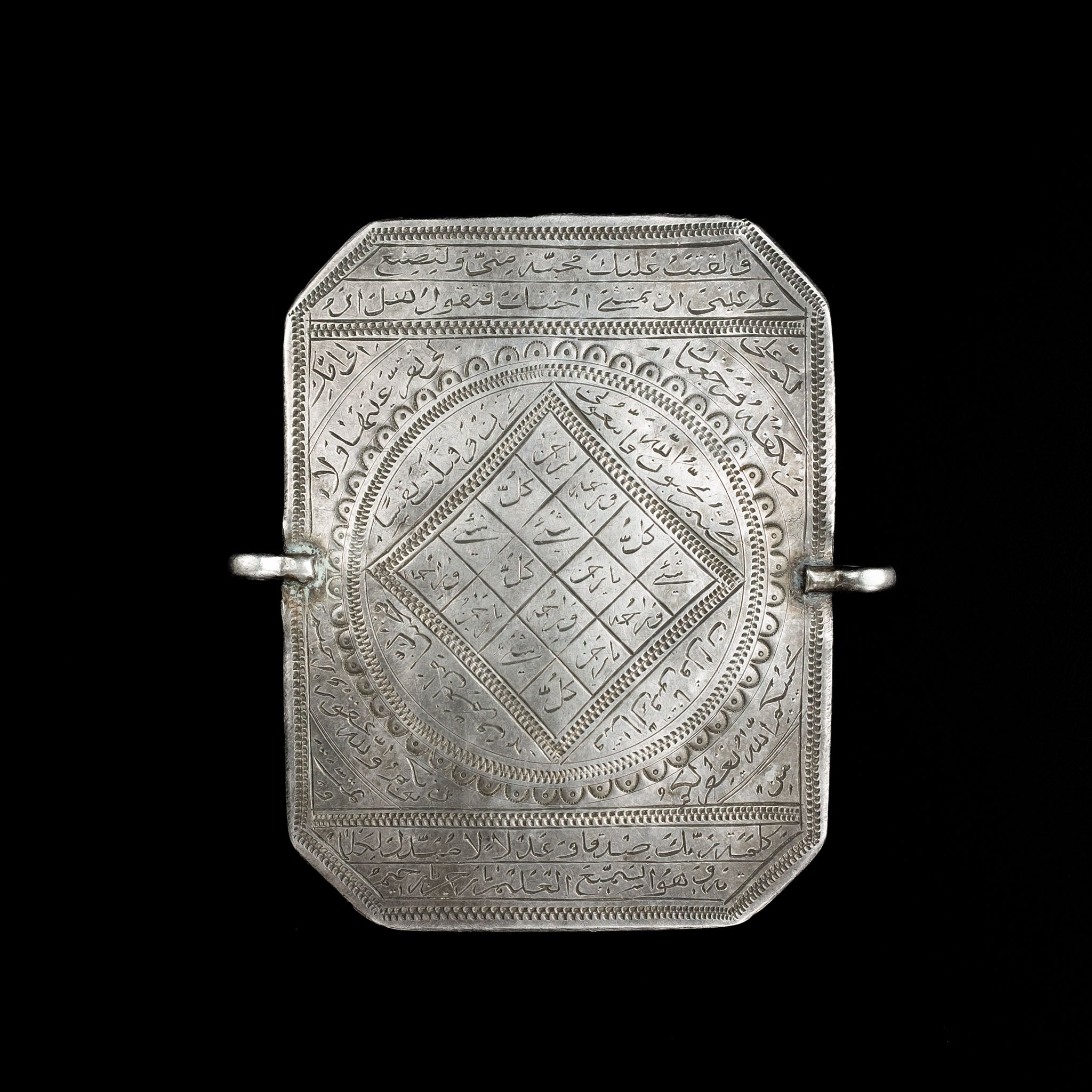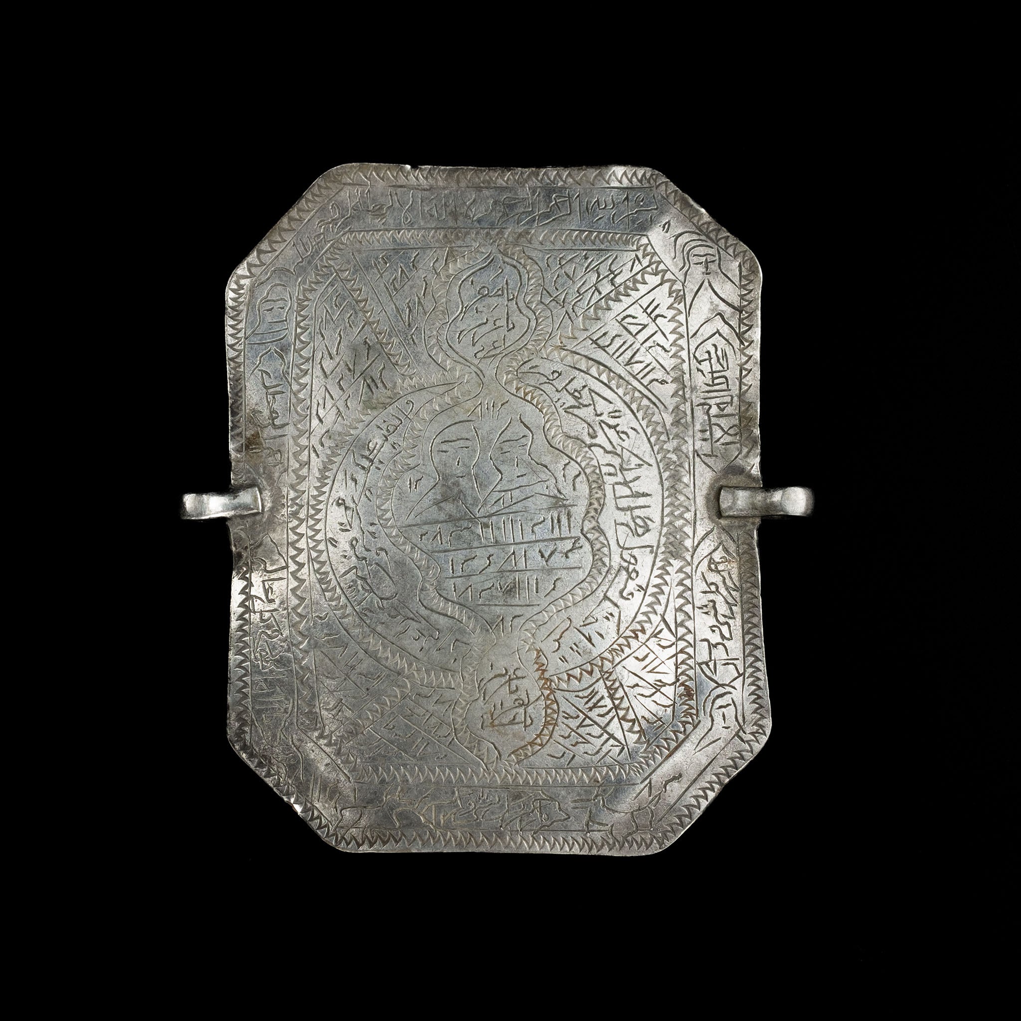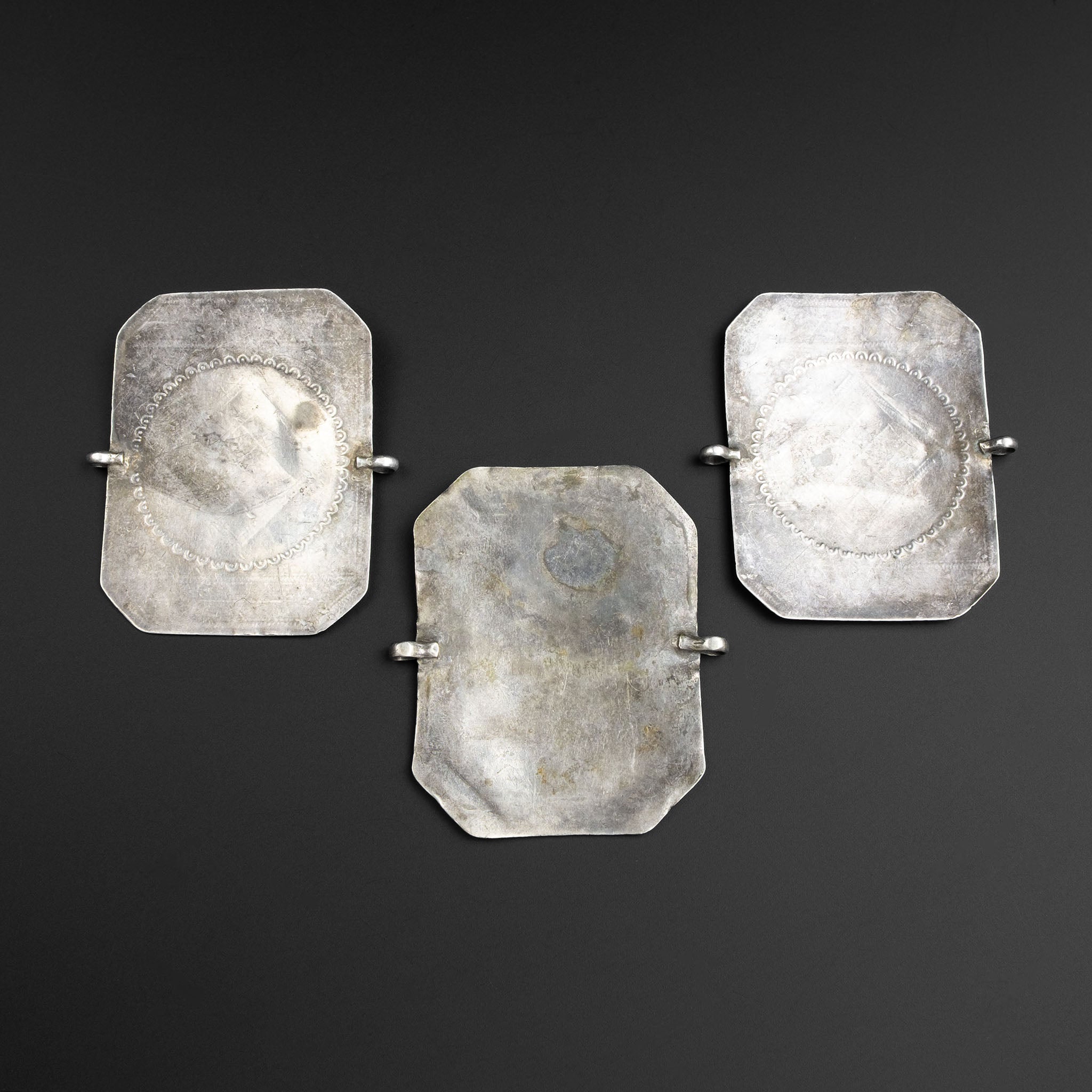These are three magnificent plaque amulets from an old Islamic bazuband, made in the Qajar era. They form an upper arm ornament believed to offer protection from both physical and spiritual harm. The plaques are finely engraved. Two of the plaques appear to be identical; the third presumably has been worn as the central piece to this bazuband.