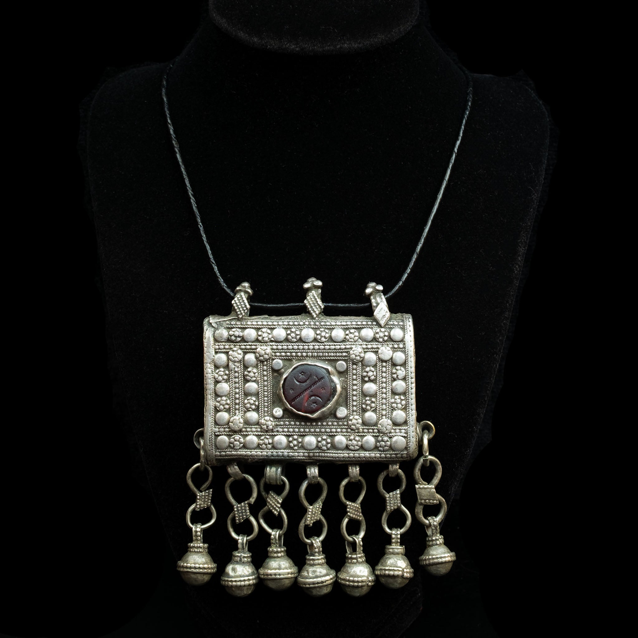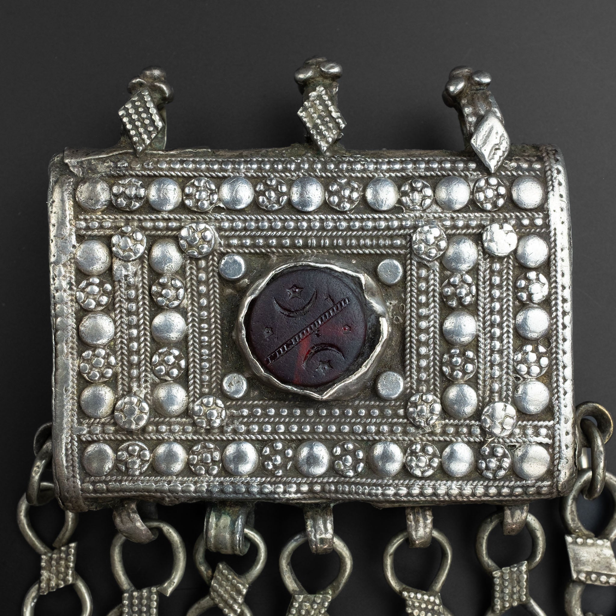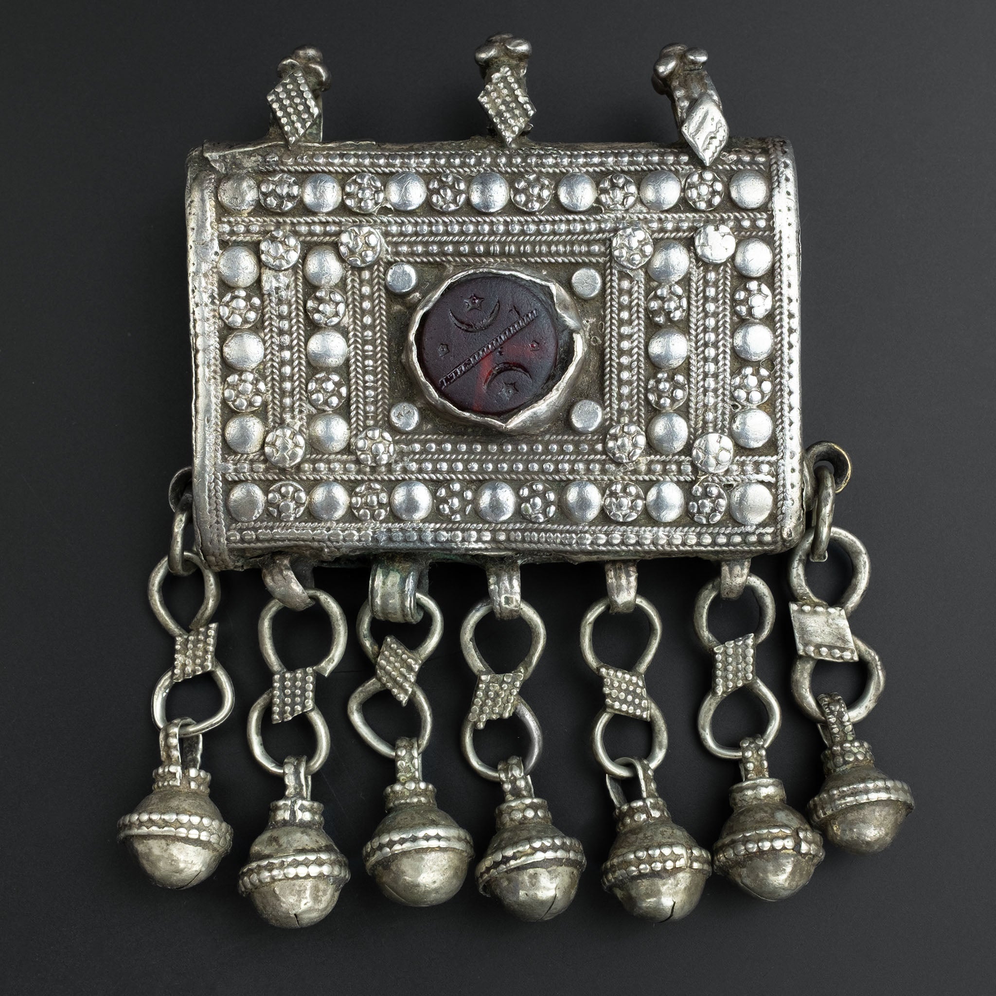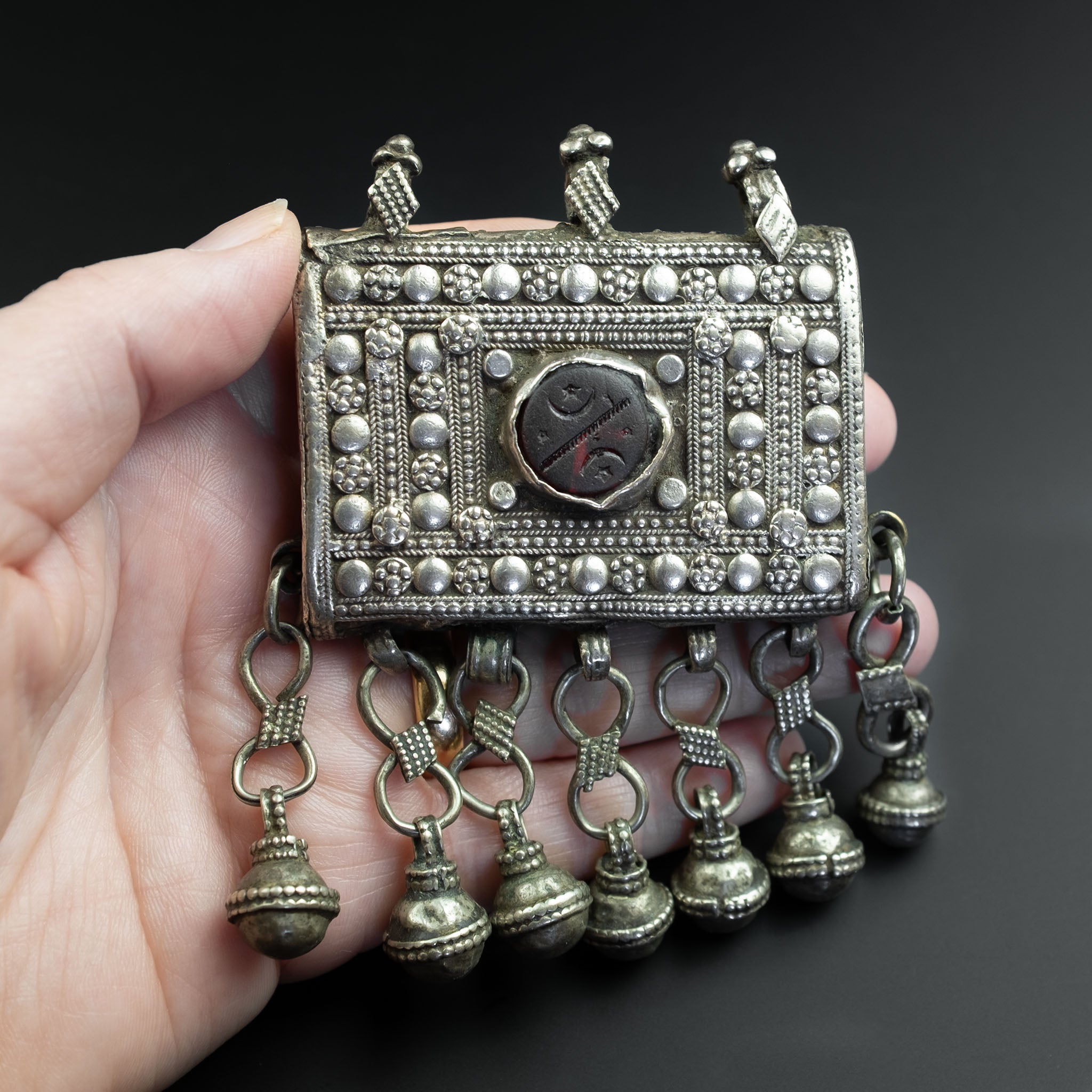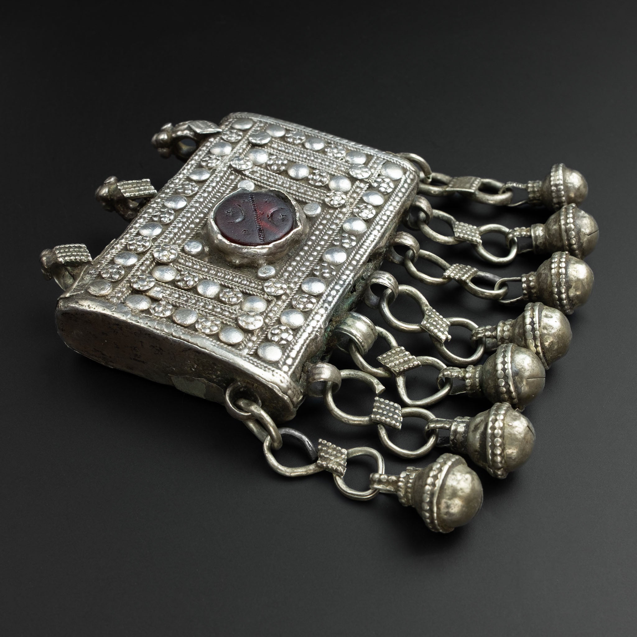 The handcrafted design on the front of the box uses filigree and granulation to give it beautiful texture. At the centre is a glass cabochon, etched with the Islamic crescent moon and star cultural symbol. Bell-shaped dangles hang from the hirz, traditionally believed to ward off evil through the jangling sound of the bells.