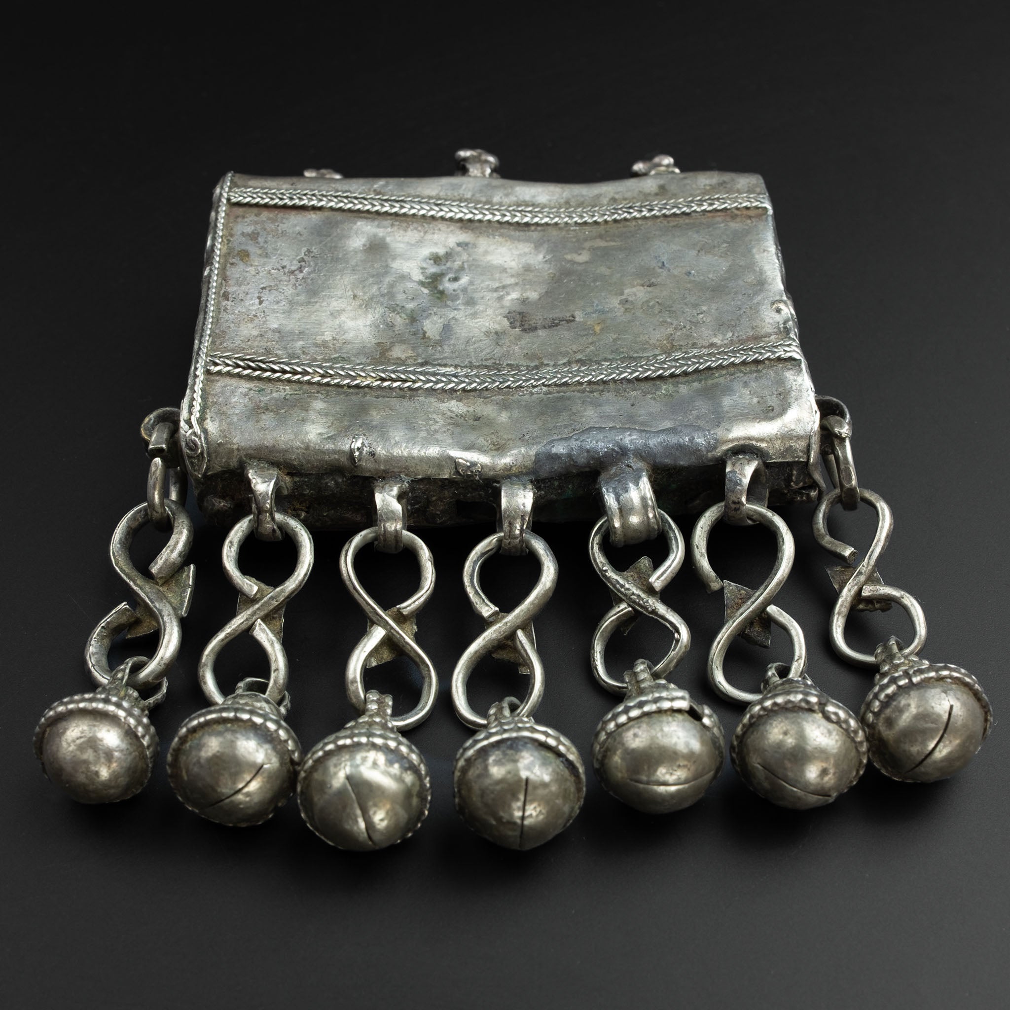 An ornate antique silver hirz from either Yemen, Oman or Ethiopia, where similar ornate box amulets were traditionally worn by women. They were used as an amulet to offer protection from harm. Such amulets are usually made of white metal. However, this amulet tests as having approximately 40-50% silver purity.
