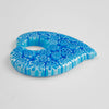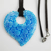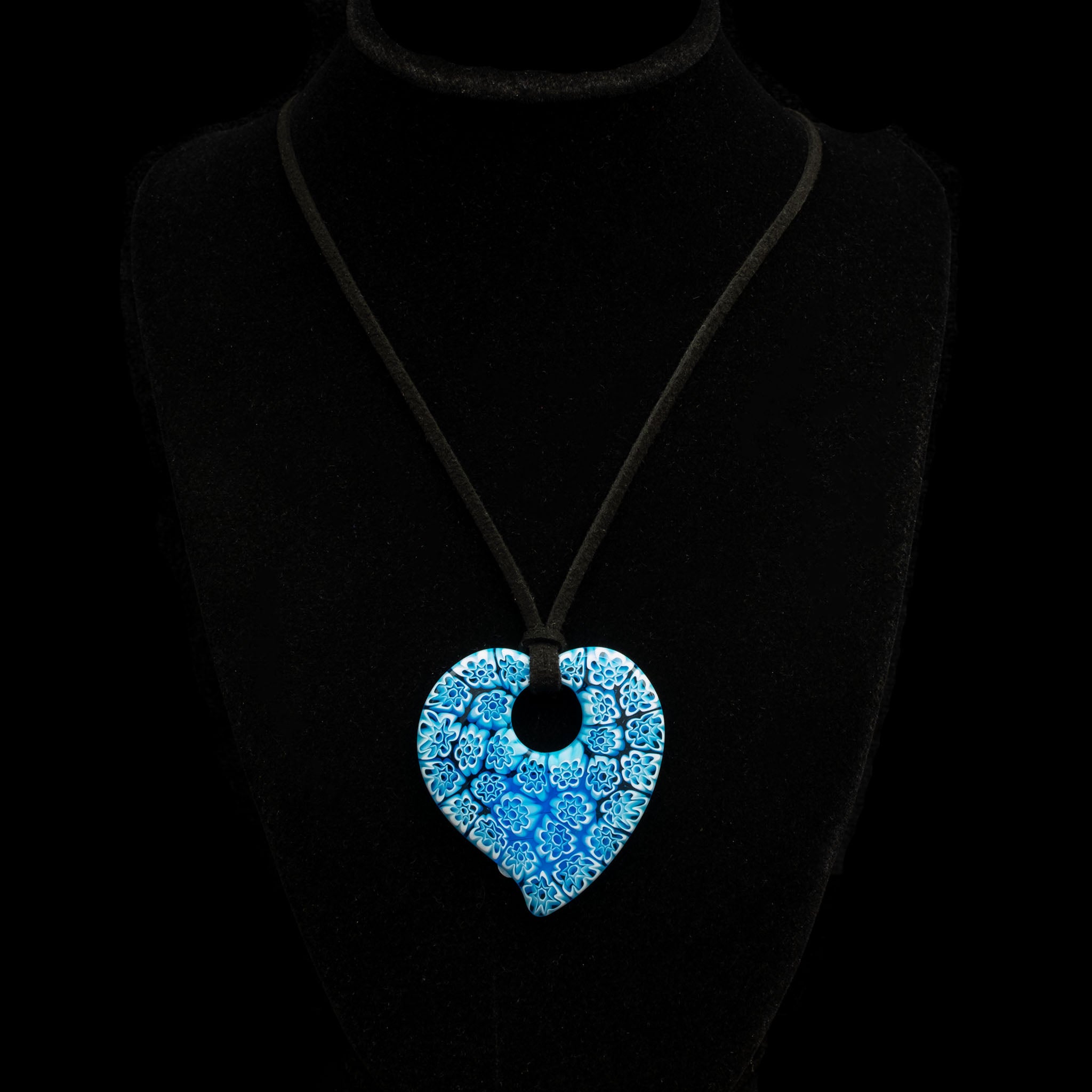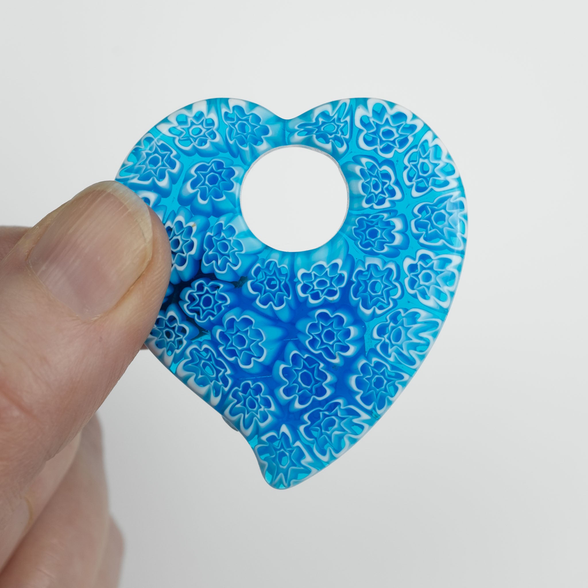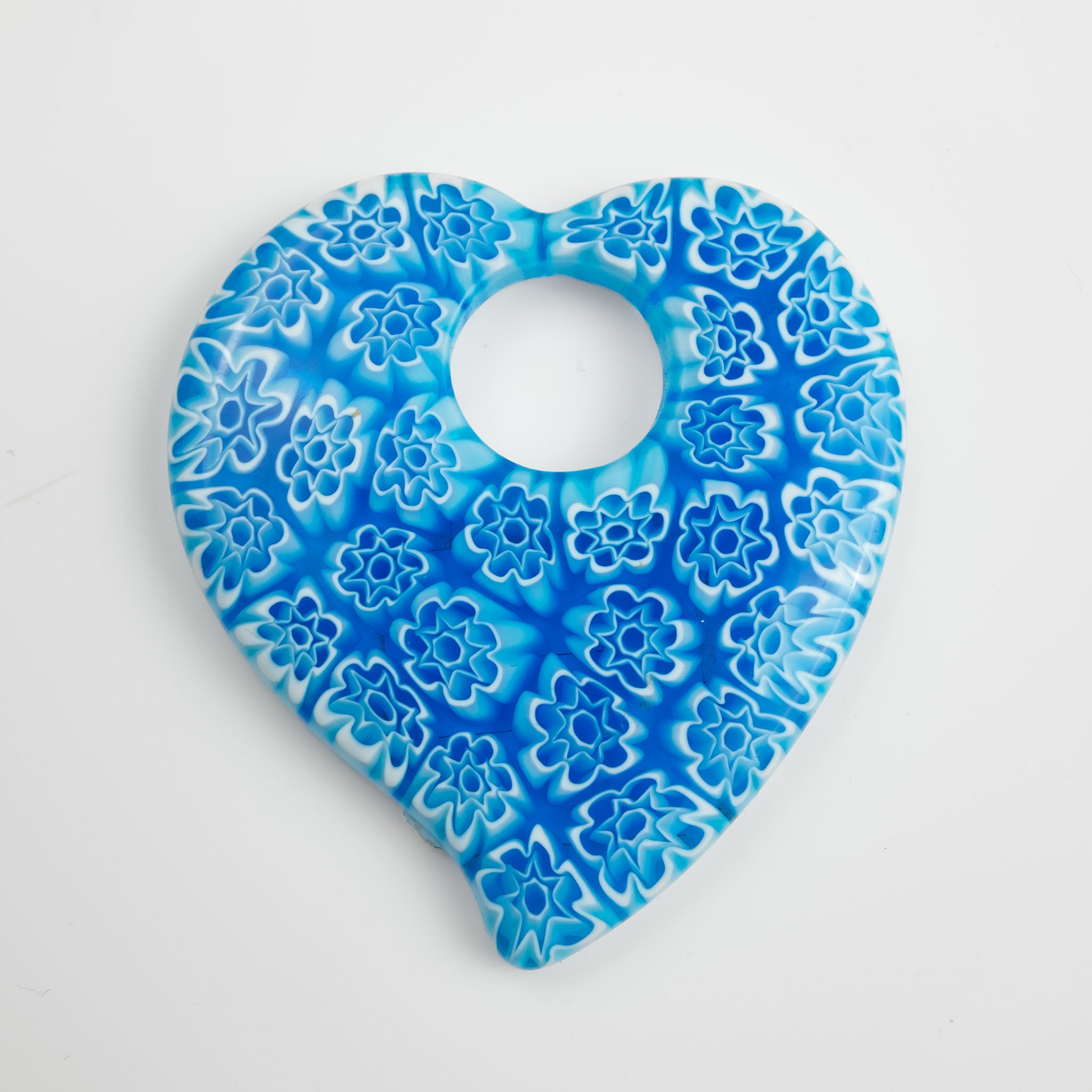 The design on this lovely blue heart-shaped pendant is made using a technique called ‘millefiori’ (which translates as ‘a thousand flowers’) to produce the distinctive decorative pattern. Held up to the light, you can see the translucent aspect of areas of the glass between the flower designs.