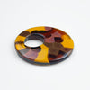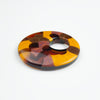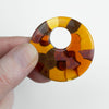 This stunning circular coloured glass pendant comprises complimentary shades of glass on the orange/pink spectrum, all layered to form a unique design. Held up to the light, you can see the translucent aspect of areas of the glass. It is very attractive.