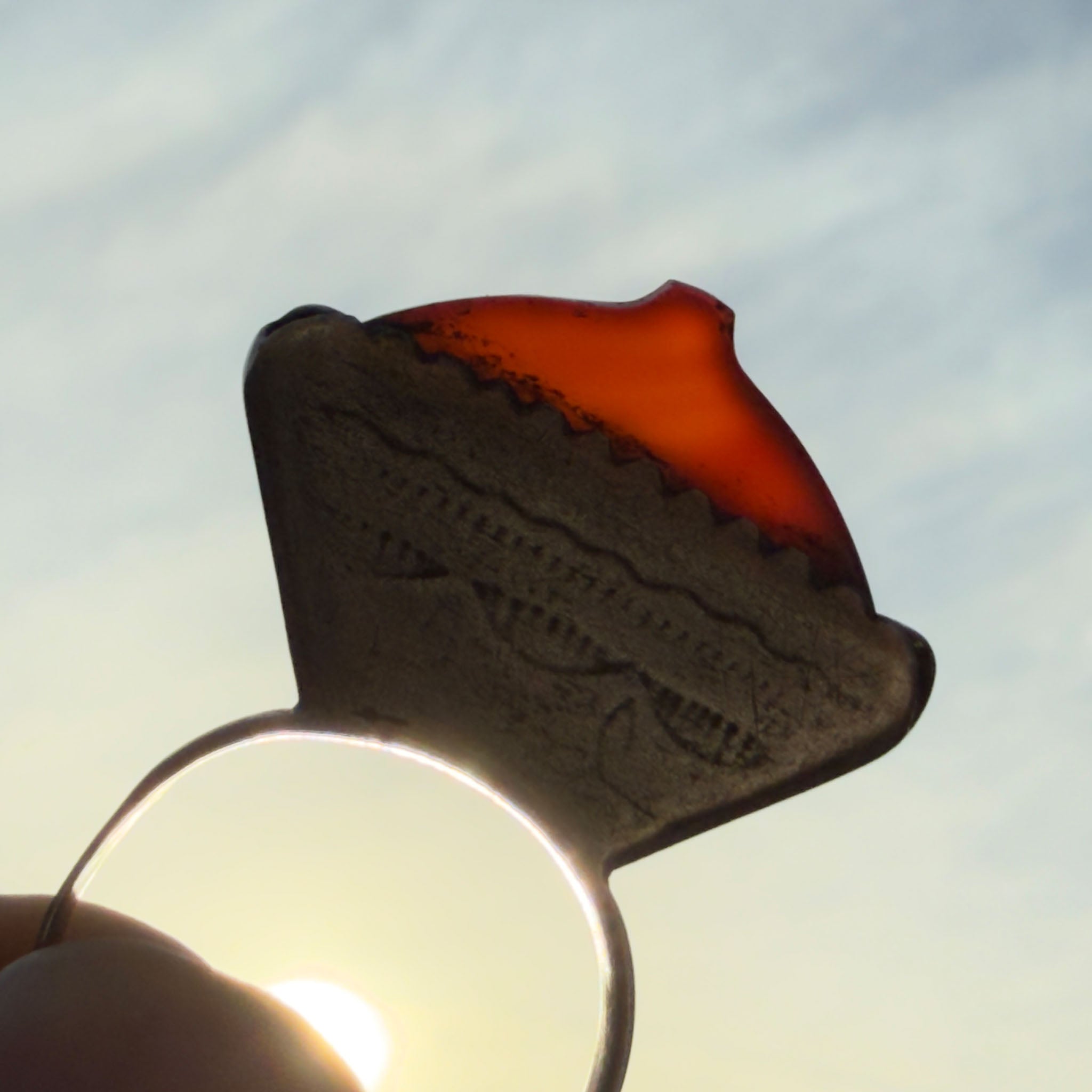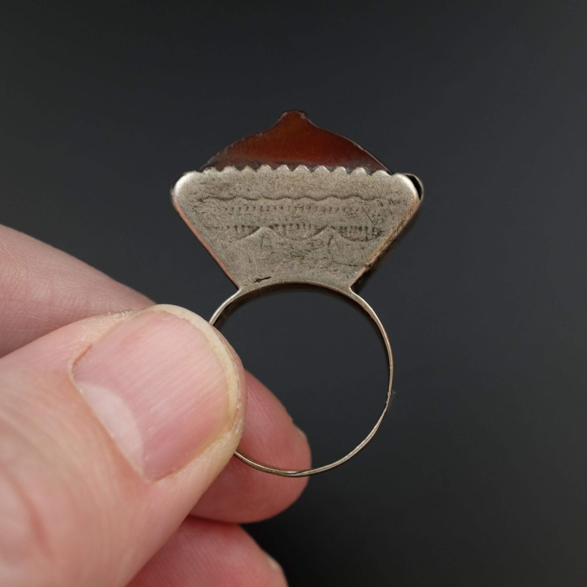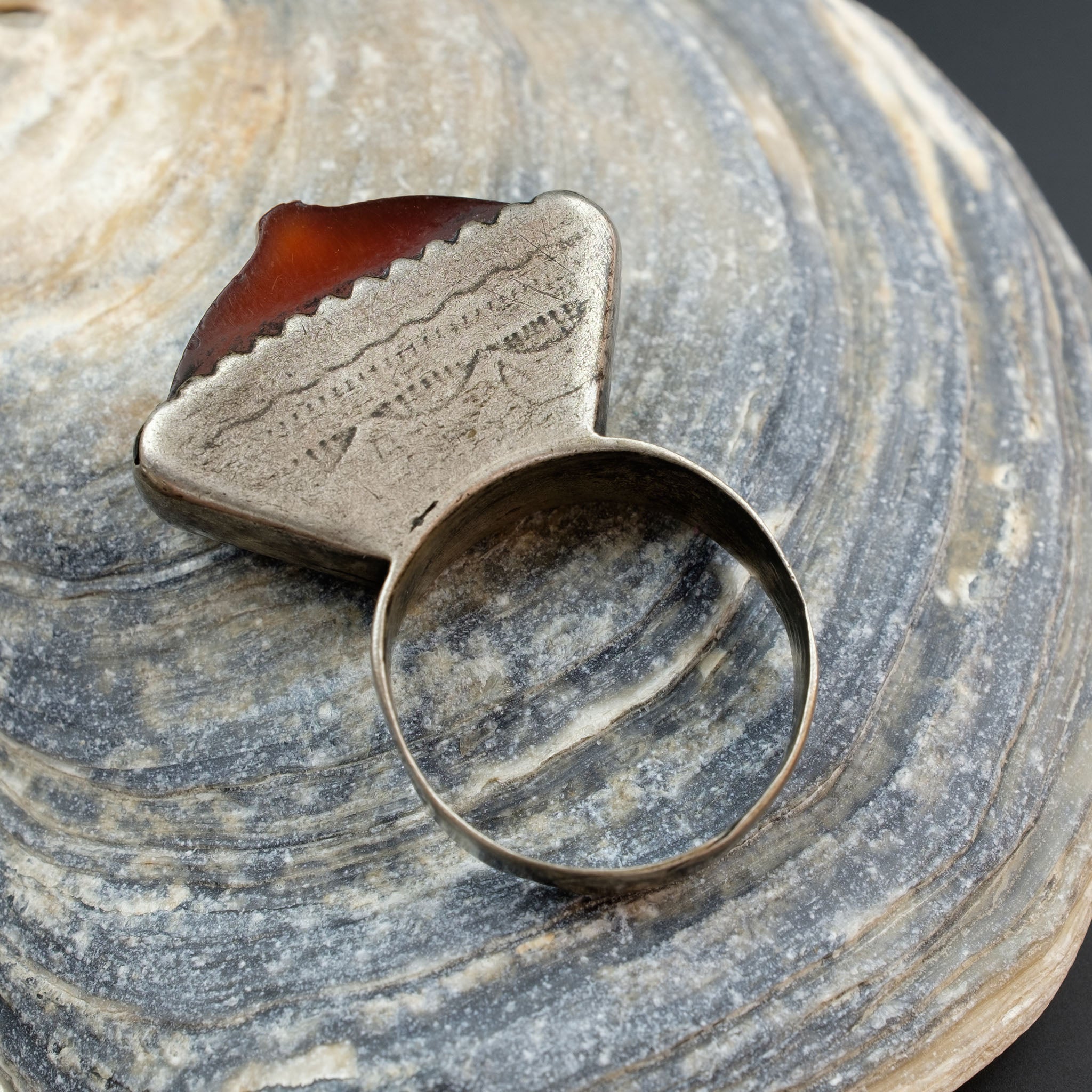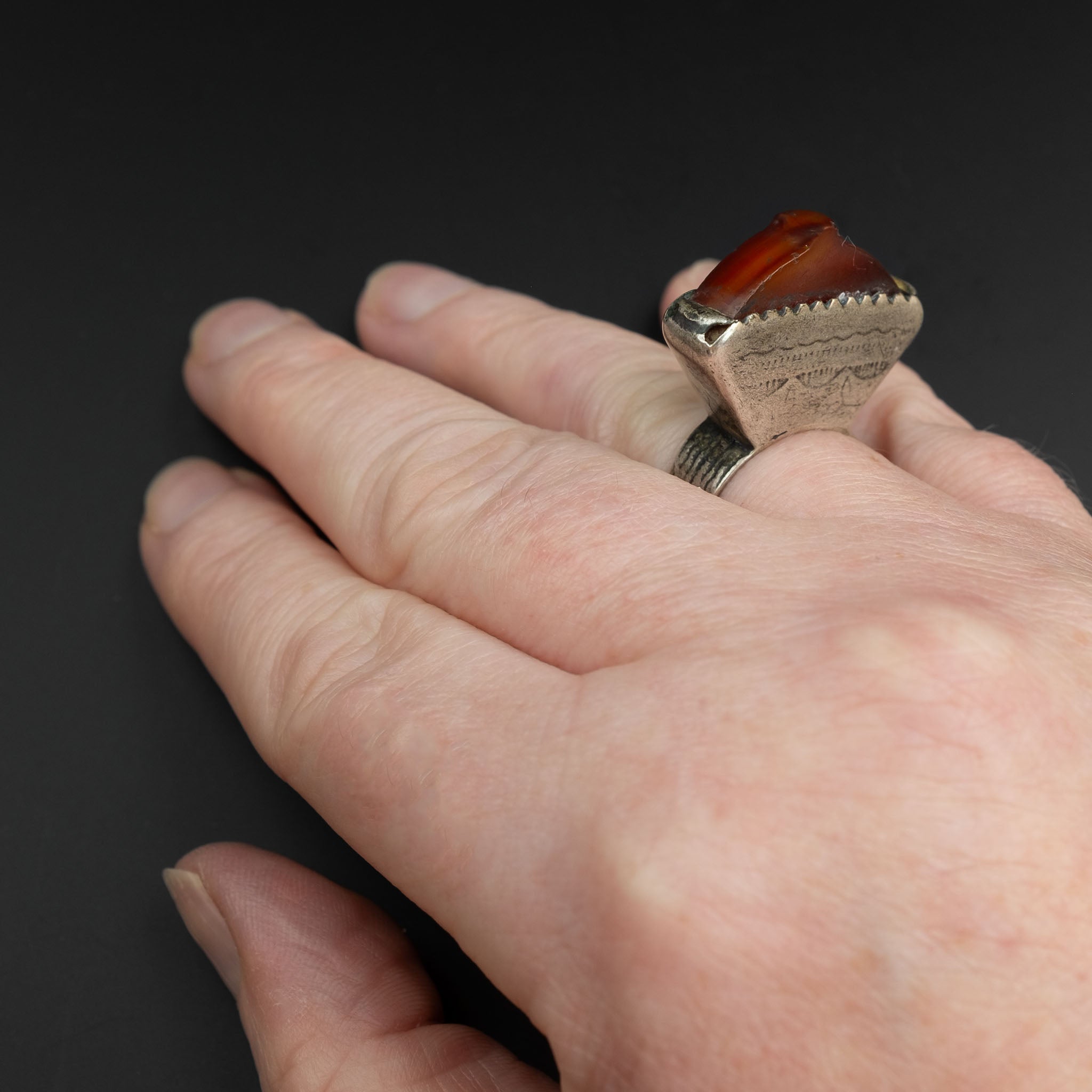 Lovely vintage Tuareg silver ring with carnelian insert, made in the 1950s. This ring is nicely decorated with hand-etched tribal designs on both sides of the silver setting and a punched design on the band.