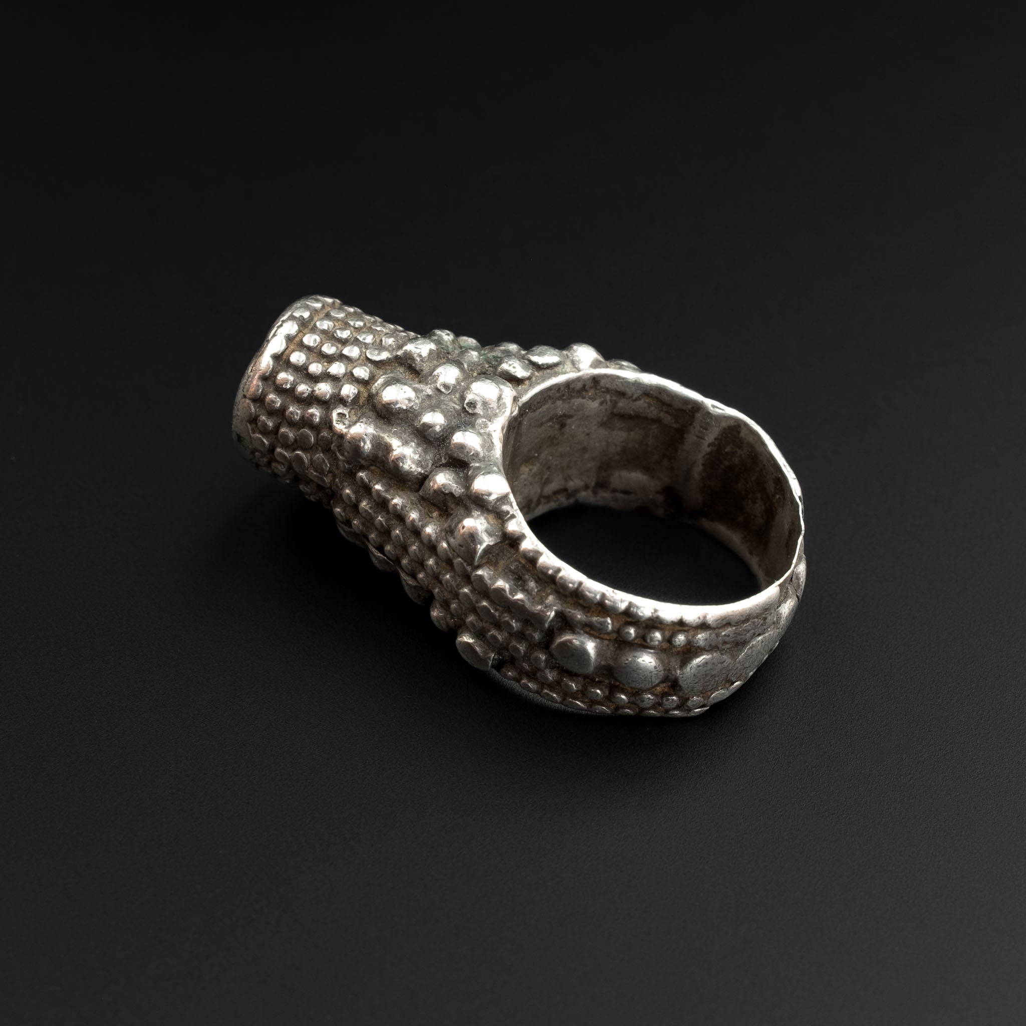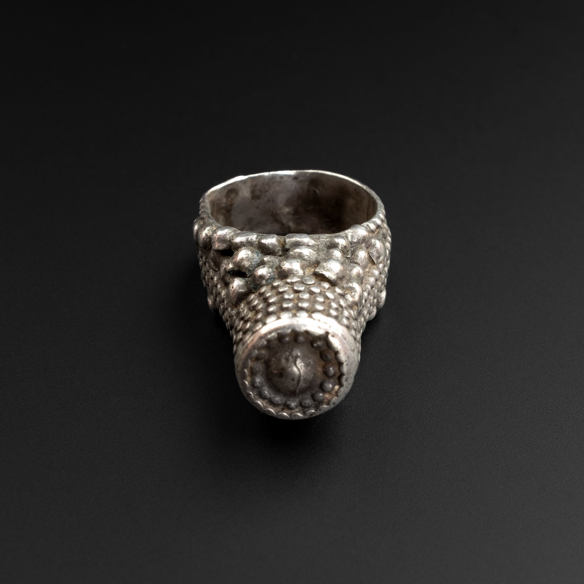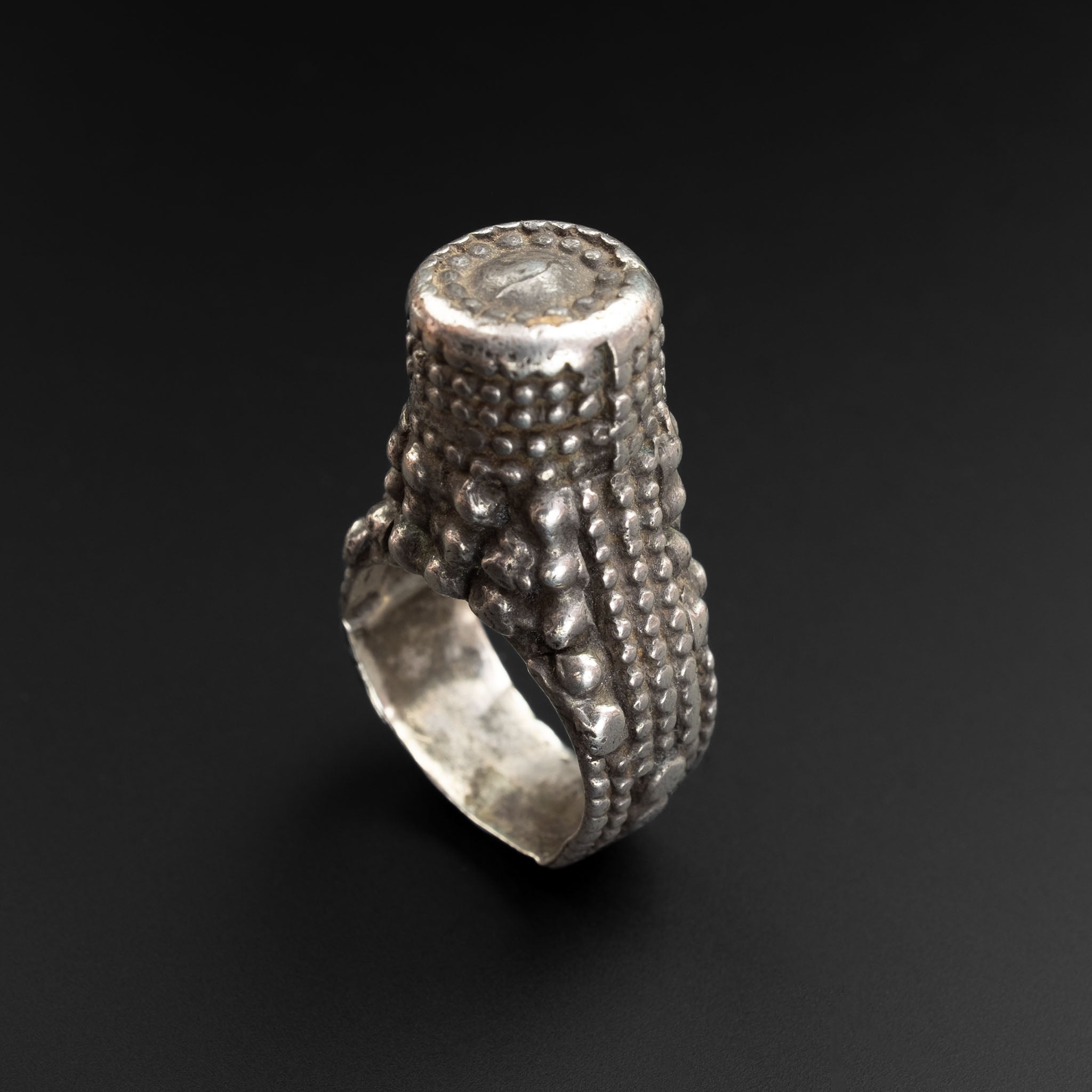 A beautiful old high-grade silver Yemeni tower ring, made in the 1960s. This quality traditional ring is ornately decorated with silver granulation, some of which has been smoothed down around the band by years of wear. It was obviously a well-loved piece. Suitable for small fingers. An attractive ring to collect or wear. In good vintage condition.